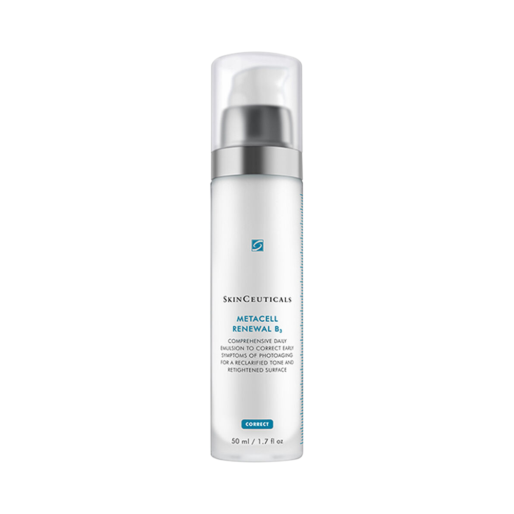 Metacell Renewal B3 utilizes a patent-pending aqueous emulsion to deliver a high concentration of 5% niacinamide (vitamin B3) combined with a firming tripeptide concentrate, and 15% pure glycerin to address early signs of photoaging. While signs of photoaging appear at different intensities according to skin biology, lifestyle, geography, sun protection behavior, and skincare regimen, they have a multiplicative effect, creating a prematurely-aged appearance. This comprehensive daily emulsion visibly improves these early signs of photoaging by increasing cell turnover to resurface skin, help reclarify and even skin tone, and improve the appearance of wrinkles and surface elasticity.